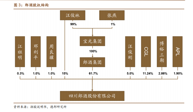 其实,此前郎酒上市失败,首先就跟当年的改制以及此后的股权脱不开关系。目前汪俊林家族握有郎酒76%的股权,而其他三家主要的机构股东CGL(Crystal Glitter Limited)、博裕三期、APL(Apsif Pte Ltd)持股16%。