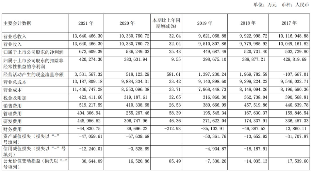 2022年3月29日,长城汽车发布的年报显示,2021年营业收入为1364.05亿元,同比增长32.04%;归属于上市公司股东的净利润为67.26亿元,同比增长25.43%。