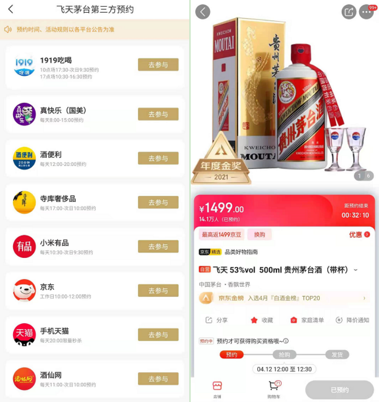 鉴于飞天茅台的特殊属性,无论线上还是线上,一众经销商都将之作为引流工具。以电商平台为例,天猫、京东、国美等平台甚至将之与平台付费会员权益绑定,开通会员后才有资格以1499元的指导价抢购。
