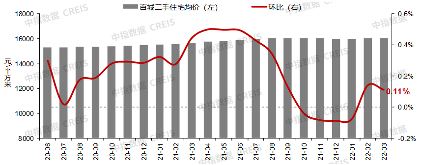 2022年3月中国百城二手住宅价格及环比涨跌幅