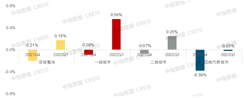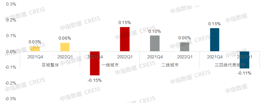 图:2021年四季度至2022年一季度百城及各梯队城市二手住宅价格累计涨跌幅对比