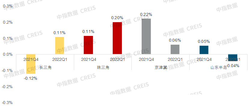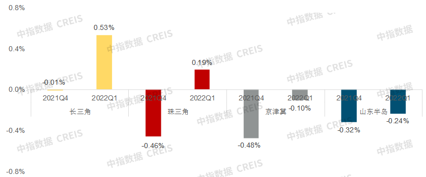 图:2021年四季度至2022年一季度各主要城市群新建住宅价格累计涨跌幅对比