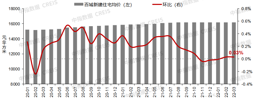 图:2020年1月至2022年3月百城新建住宅均价及环比变化