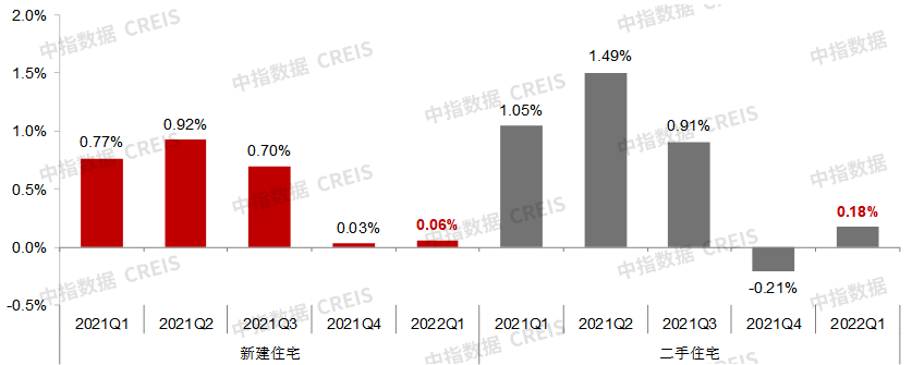 图:2021年至2022年一季度百城新建及二手住宅均价累计涨跌