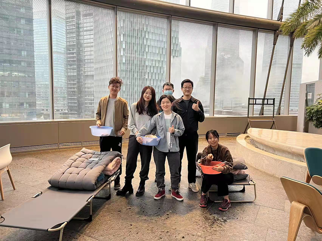 “一开始准备住两天,后来陆续有同事所在社区被封闭,我干脆暂时在办公室里‘安家’了,这一住就是大半个月。”马逸钧说,好在公司提供了充足的后勤保障,不仅有一日三餐、水果零食,还准备了行军床和洗漱用品。唯一觉得不便的是办公楼里的浴室数量有限,驻守公司的数十位员工常常需要“排队”洗澡。