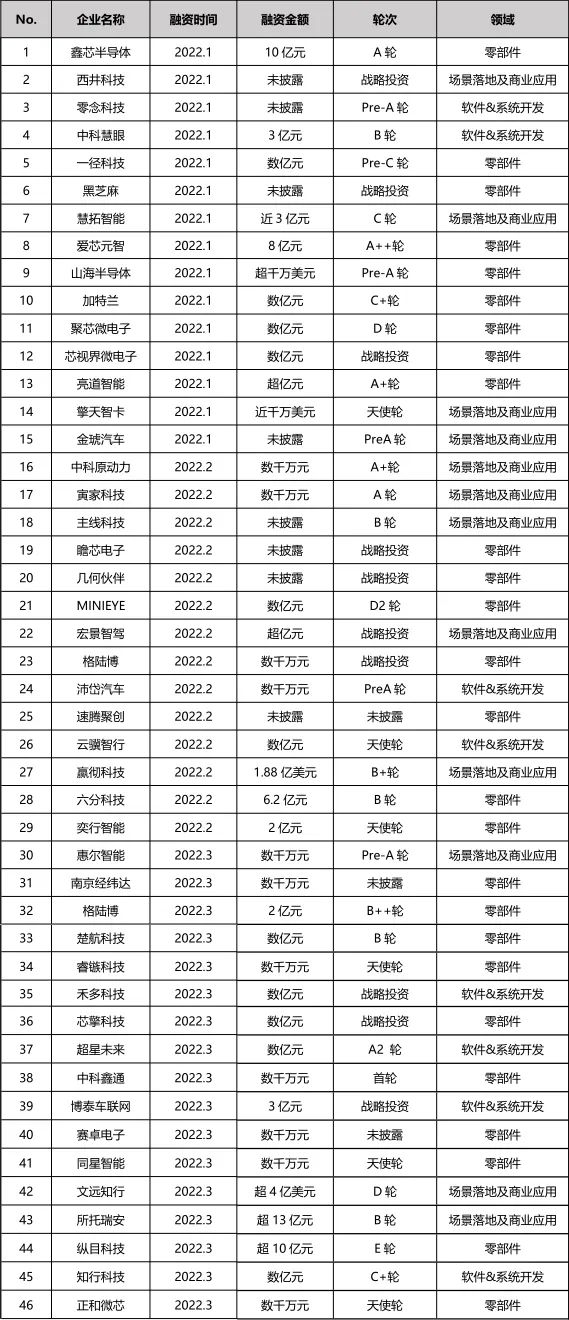 表2:2022年第一季度国内自动驾驶行业融资情况