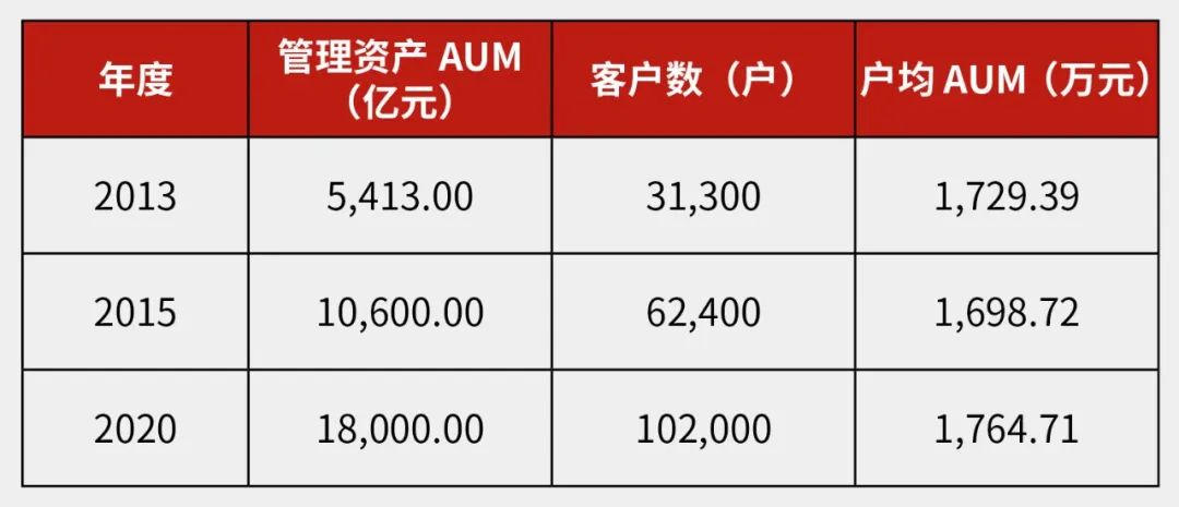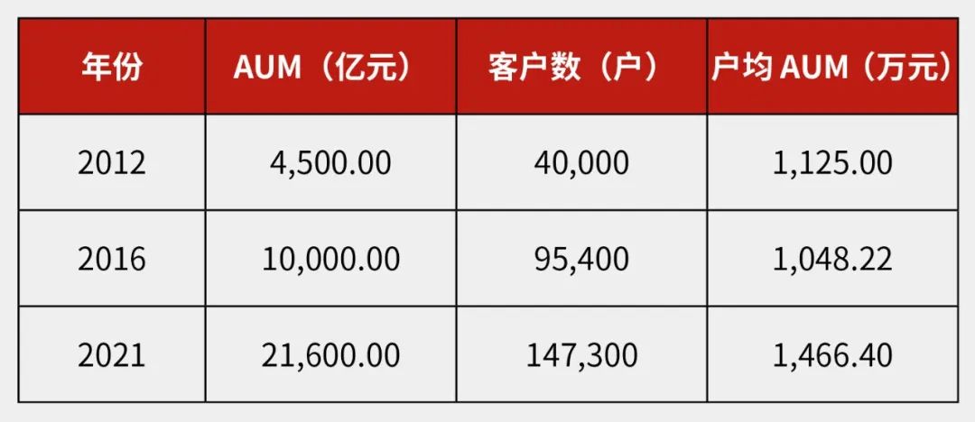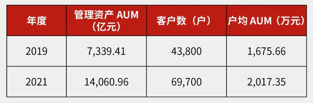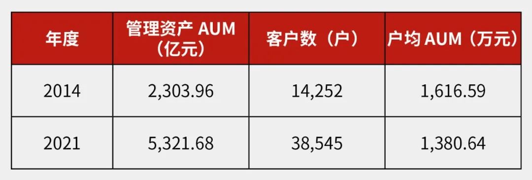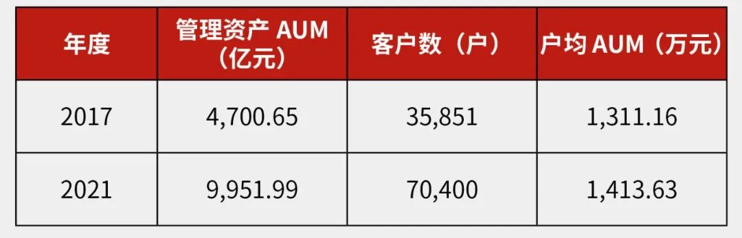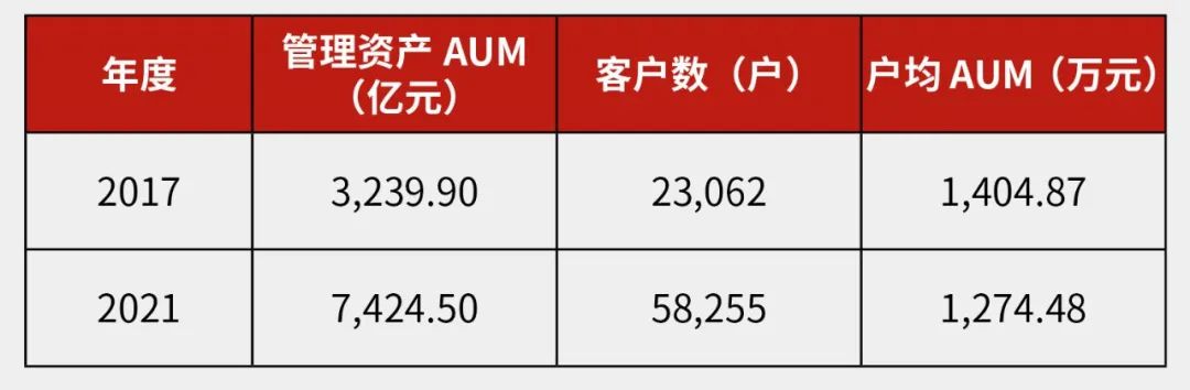 如表7,在AUM翻一番的这4年间(从2017年到2021年),其户均AUM从1,311.16 万元增长到1,413.63万元,增长了7.82%。