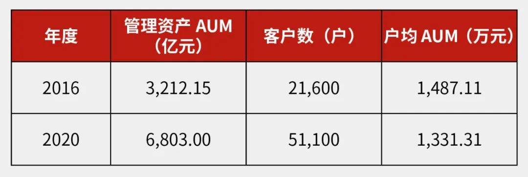 如表9,在AUM翻一番的这4年间(从2016年到2020年),其户均AUM从1,487.11万元下降到1,331.31万元,下降了10.48%。