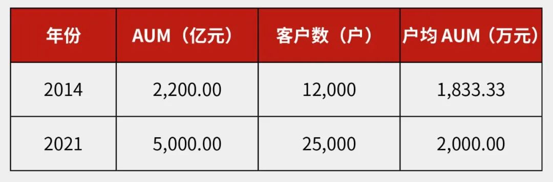 如表12,从2014年到2021年的7年间,其户均AUM从1,833.33万元增长到2,000.00万元,增长了9.1%。