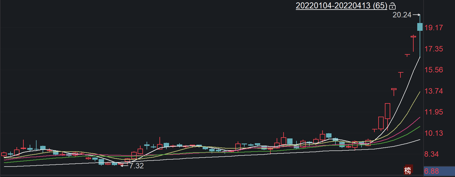 从盘中走势来看,该股4月13日早间开盘后快速拉升涨停,10点30分后又快速回落,午后一度跌停,尾盘又再次拉升触及涨停。当日成交量110万手,成交额超21亿元,换手率高达58.95%。至此,国统股份股价在短短9个交易日累计涨幅106%。