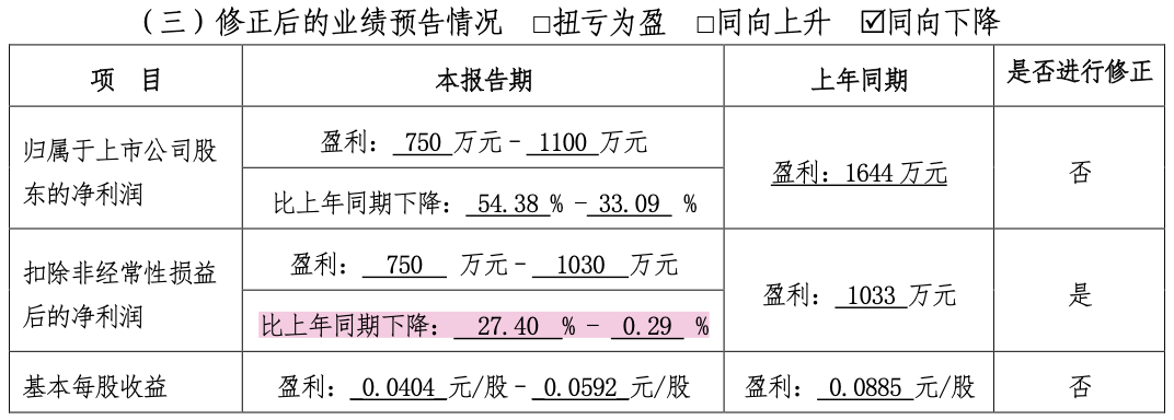 修正后的业绩预告显示,公司预计2021年扣除非经常性损益后的净利润为750万元至1030万元,同比下降27.40%至0.29%。较修正前,预计最高扣非净利润减少了1239万元。