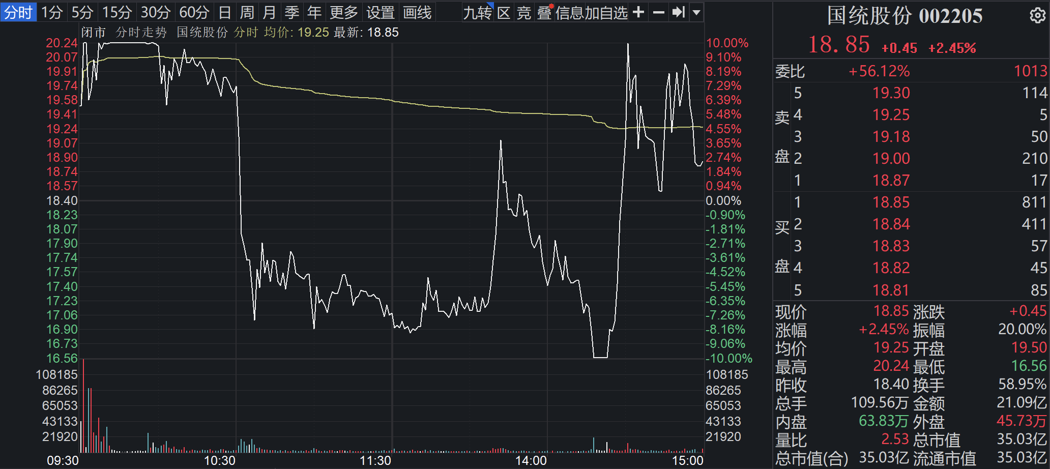 4月13日,国统股份(002205.SZ)“天地板”跌停后,又上演“地天板”。当日股价最终上涨2.45%,报18.85元/股。