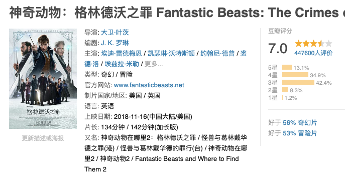 距离《神奇动物:格林德沃之罪》上映已经过去近四年。当时舆论对那部电影的评价已经是毁誉参半,虽然豆瓣评分仍在7分以上,但已经有许多影迷指出《格林德沃之罪》的缺陷:故事线杂乱、各种生硬无聊的家庭伦理戏,魔法特效缺乏想象力……