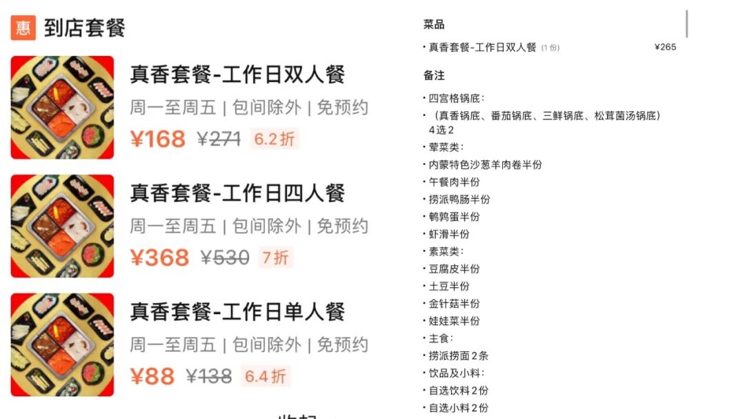 例如,海底捞近日在部分门店里推出“真香套餐-工作日”——单人餐(88元)、双人餐(168元)、四人餐(368元)。摊算下来,远远低于海底捞的人均消费金额。