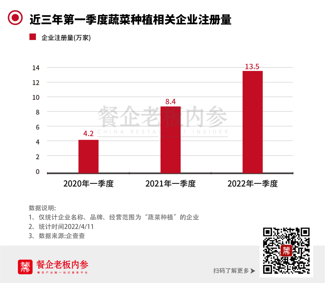 企查查数据显示,我国现存“蔬菜种植”相关企业198.2万家。2019-2021年注册量分别是22.2万家、31.3万家、43.7万家。2022年Q1季度,蔬菜种植企业新注册了13.5万家,同比增长60.7%。