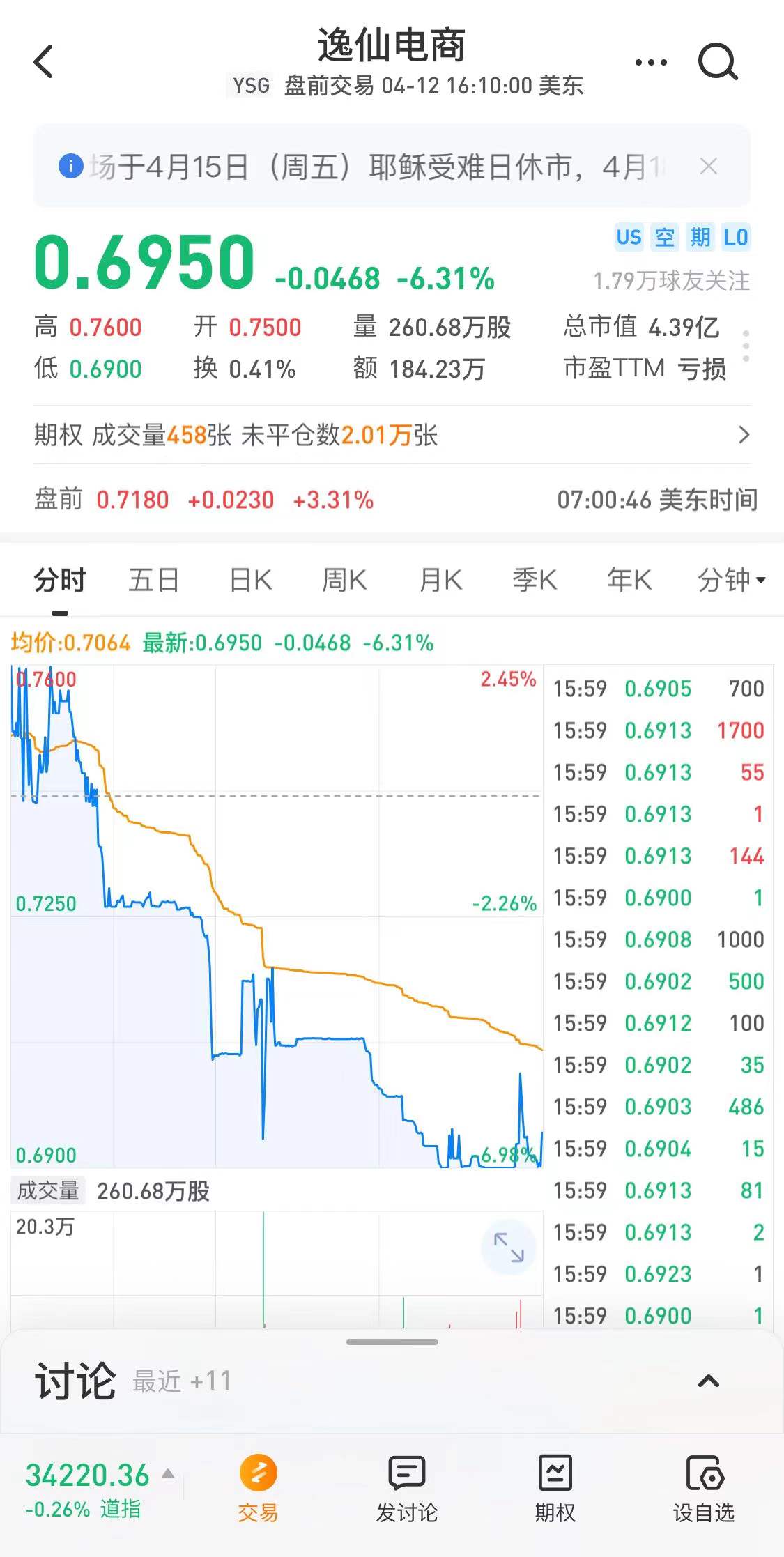 截止4月12日美东收盘,逸仙电商再跌6.31%,以0.695美元/股收盘,总市值下跌至4.39亿美元。