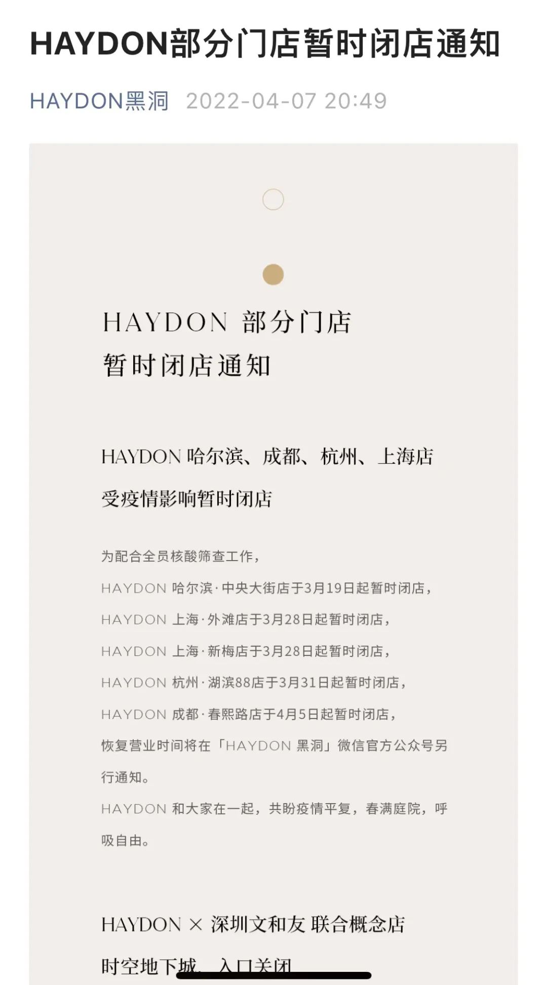 雪上加霜是,不仅没有如当初规划的快速布局,受今年的疫情反复,黑洞还于3月下旬先后暂闭了哈尔滨店、杭州店以及上海外滩店、新梅店。4月以来,闭店范围还在扩大。4月5日起成都春熙路店宣布闭店,暂闭门店数量超过40%。