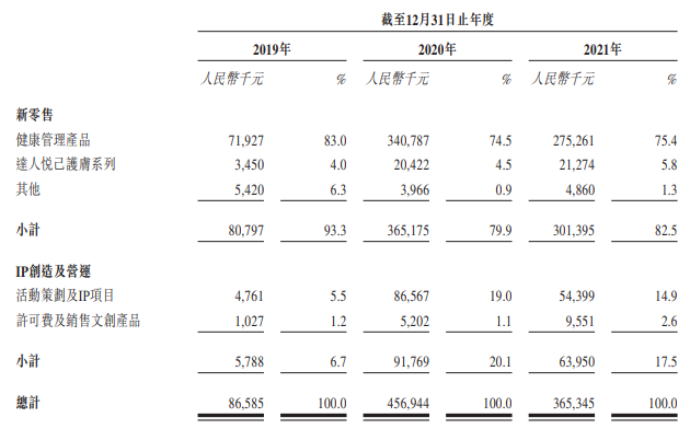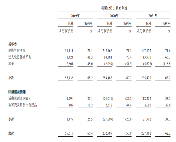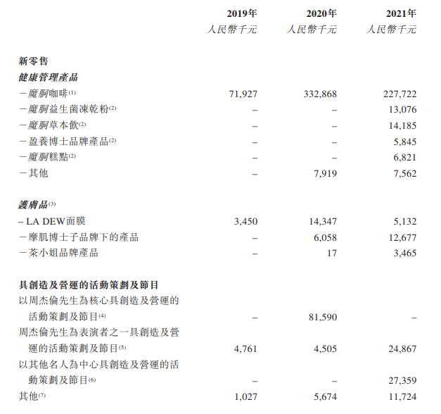一是新零售,卖减肥饮品( 魔胴防弹咖啡)、护肤品等产品,去年收入3.01亿元,其中健康管理产品收入2.75亿元,占年度总收入的75.4%;