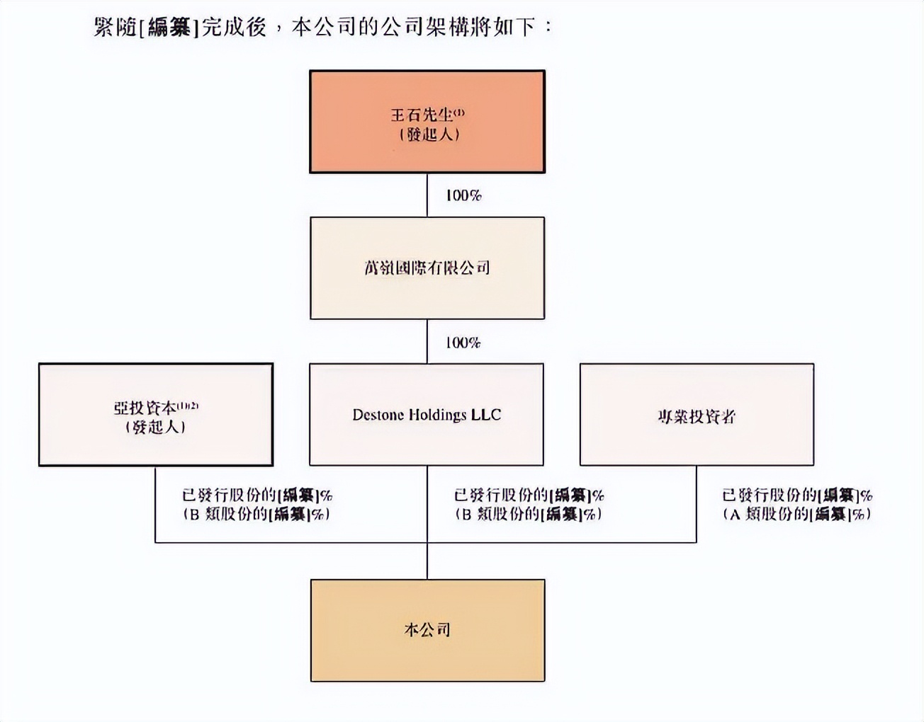 据申请书,Destone Holdings LLC(王石全资拥有的万岭国际有限公司的全资附属公司)持有公司65%的B类股份,余下35%由亚投资本持有。