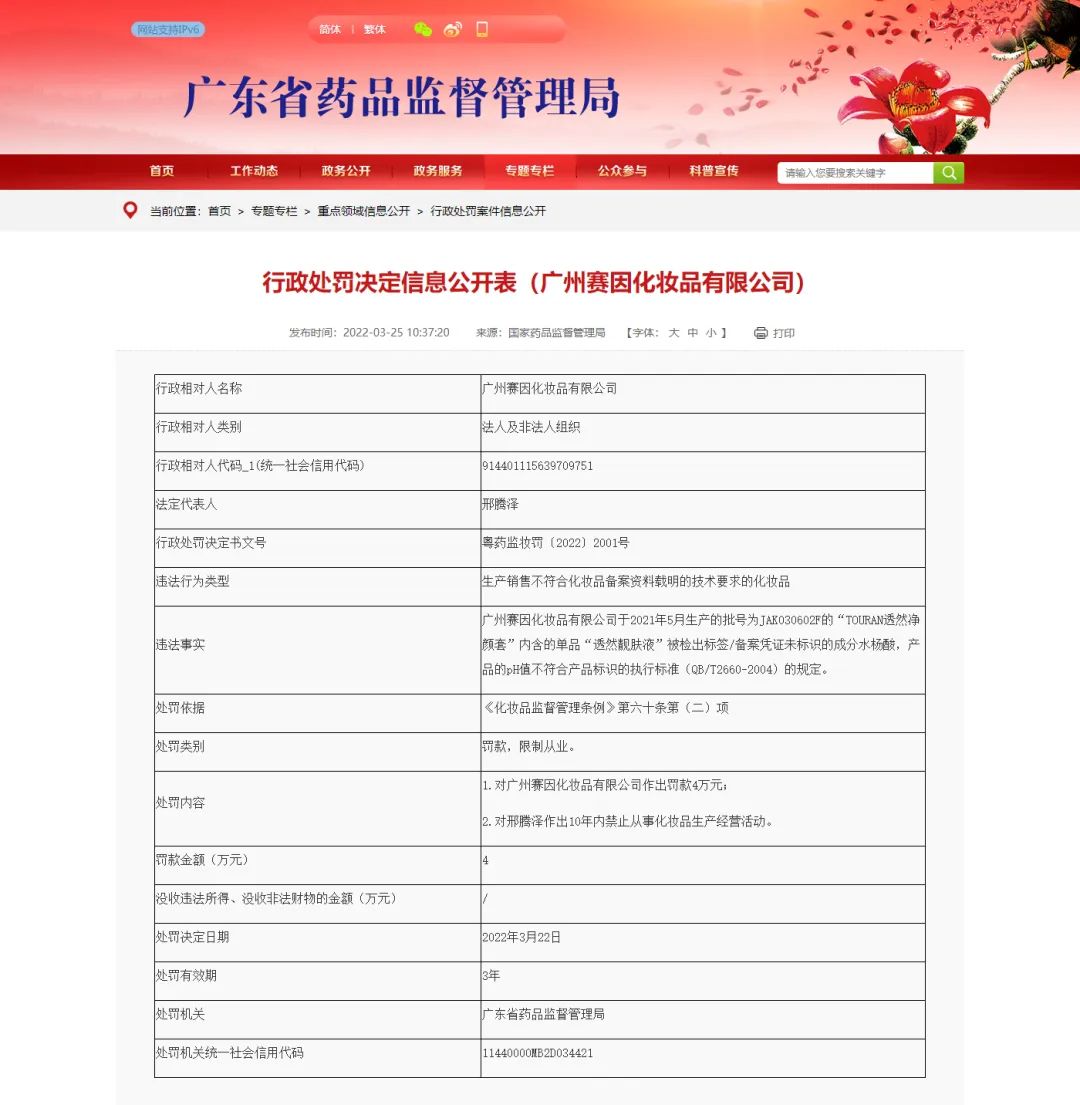 此外,今年3月,广州赛因化妆品有限公司(以下简称“广州赛因”),因生产销售不符合化妆品备案资料载明的技术要求的化妆品,被罚款4万元、公司法人被处以10年禁业。