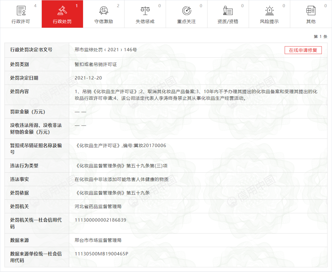 河北康正药业有限公司(下称康正药业)就因为其生产的5批次儿童用化妆品“非法添加可能危害人体健康物质”,被处以吊销化妆品生产许可证、取消化妆品备案、10年内不予办理其提出的化妆品备案或者受理其提出的化妆品行政许可申请、法定代表人终身禁业的处罚。