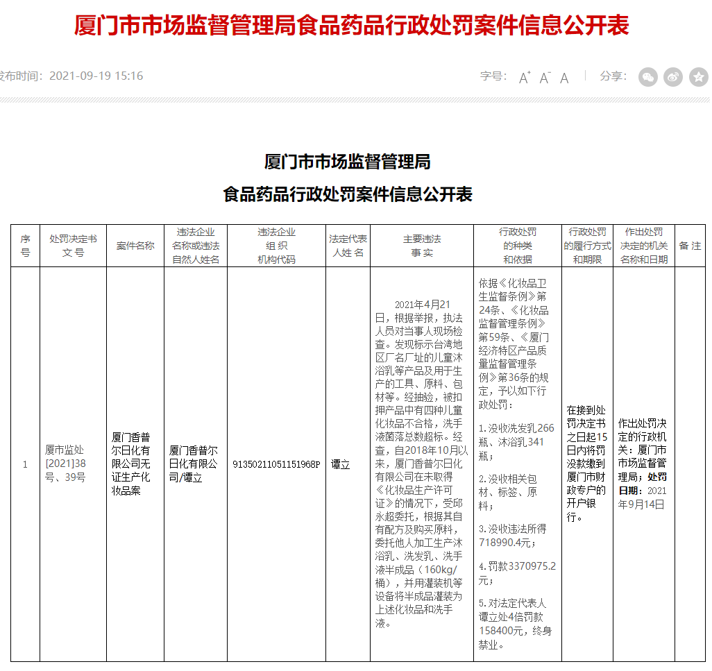 而除了康正药业,2021年9月,厦门香普尔日化有限公司(下称香普尔日化公司)因无证生产儿童化妆品,被罚没约409万元,公司法定代表人被处以15.84万元罚款及终身禁业。这也是《化妆品监督管理条例》实施后全国首个处罚到人并终身禁业的行政处罚案件。