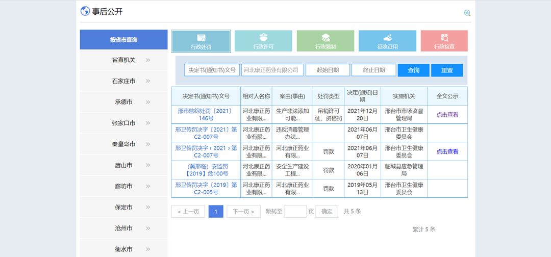 比如康正药业,根据河北省行政执法公示平台信息显示,该企业在近3年内多次被罚,被罚原因包括了违反消毒管理办法、安全生产建设工程项目违法、消毒产品标签不符合要求等等。