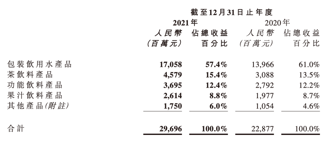 具体来看,包装饮用水依旧是农夫山泉的支柱性产品。2021年全年收益为170.58亿元,较2020年增长22.1%,在总收益中占比超半数达57.4%。但增速低于整体及其他细分业务,甚至较2020年的61%下降了3.6%。