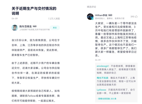 李斌在置顶评论中表示,3月中旬有些零部件就已经断供,蔚来能撑到最近实属不易。