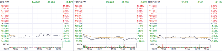 不仅蔚来一家,受到李斌影射全行业困境的影响,当天新能源板块大跌,小鹏汽车(09868.HK)和理想汽车(02015.HK)的股价亦分别下跌9.89%和8.11%。