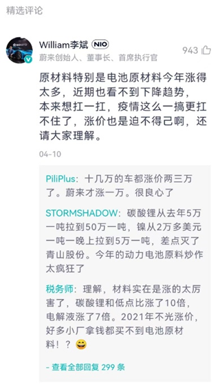 李斌在置顶的精选评论里面,也表示原材料、特别是电池原材料涨得太多,本想咬咬牙扛过去,没成想疫情又成了压倒蔚来的最后一根稻草,最终还是扛不过去了。