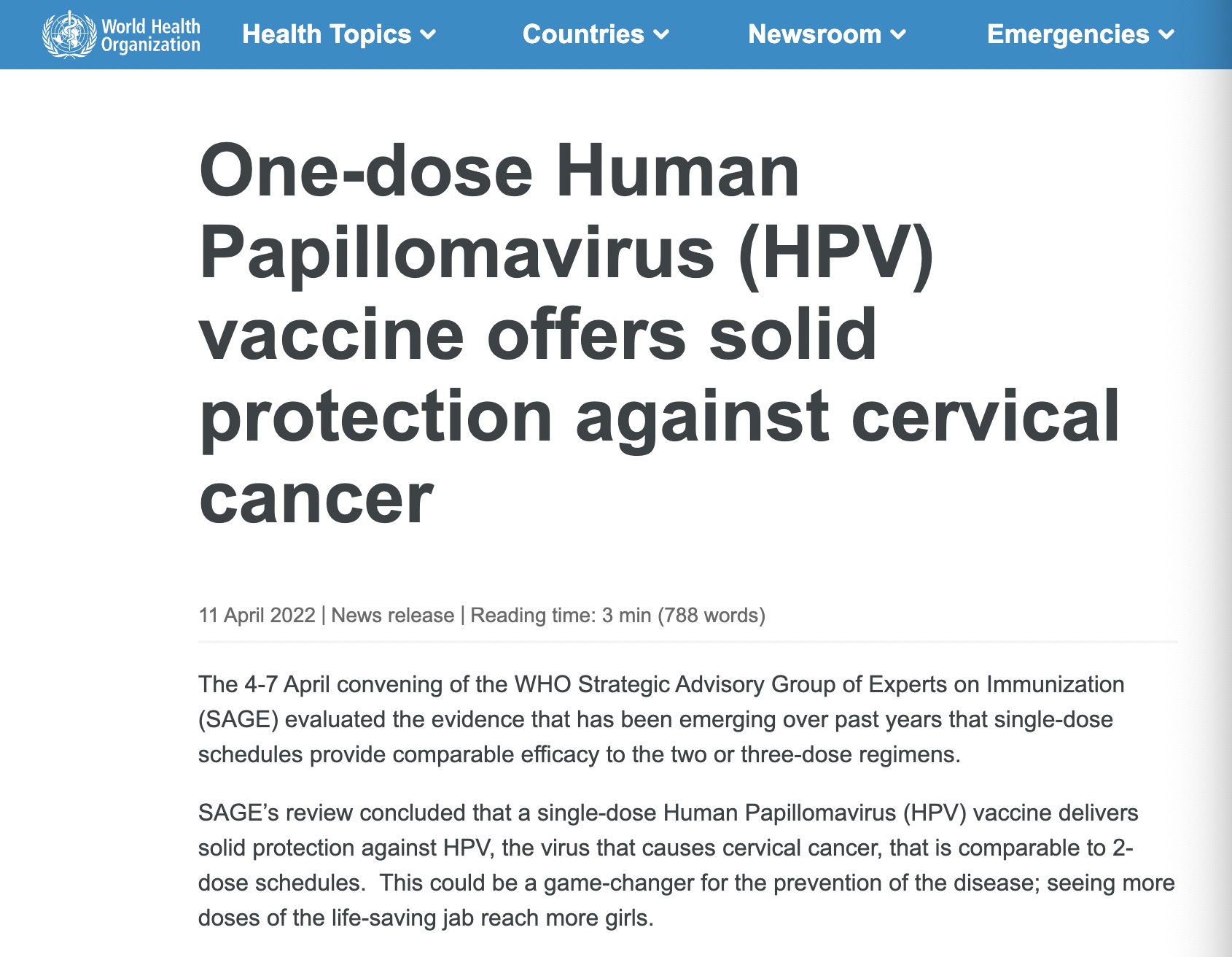 消息面上,4月11日,世界卫生组织(WHO)在其官网发布消息,WHO于4月4日-7日召开了免疫战略专家组(SAGE)会议,对1剂次人乳头瘤病毒 (HPV)疫苗接种的证据进行了审议。专家组审议认为,只接种1剂次HPV疫苗,可以产生和2-3剂次同样的免疫效果,可有效预防由HPV感染引起的宫颈癌。