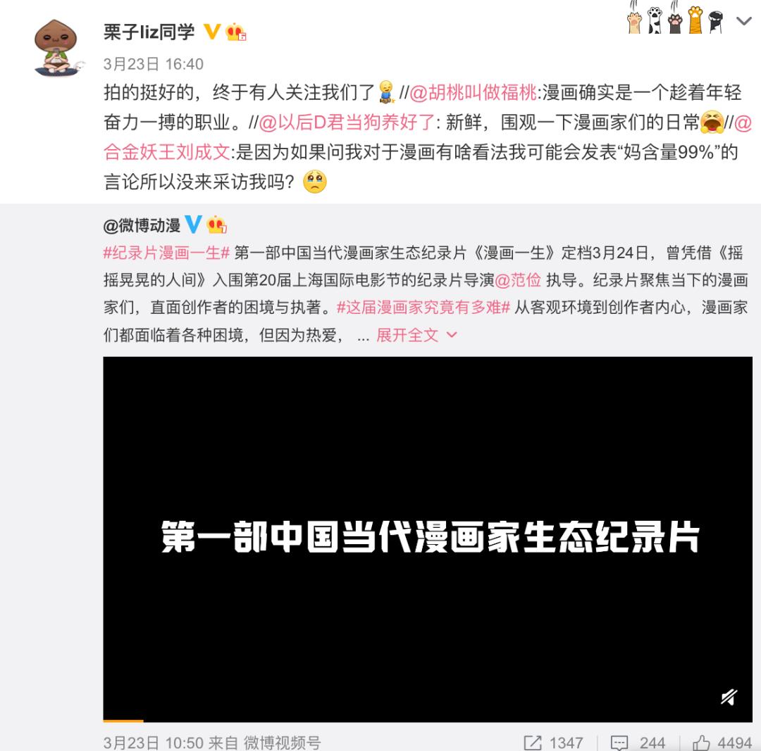 漫画一生作品热播在微博、知乎引起了漫画圈和圈外人士的热烈讨论,一位叫角年千兆的漫画作者的那句“干什么不苦,而漫画家是离梦想最近的人,少年少女们一起来成为漫画家吧!”,这代表着一群漫画创作者的心声;一位科技媒体人则说,漫画圈在他心目中一直是非常有爱的群体,看了纪录片觉得还有更多的故事值得去挖掘,自己作为漫画阅读者通过片子了解了这个群体,可以让自己更好的去理解他们的作品。