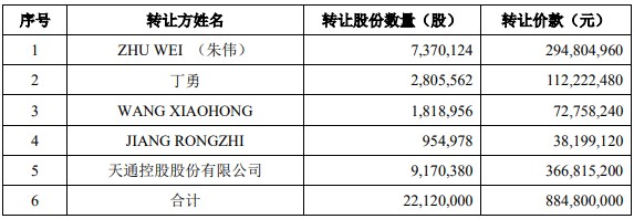 本次天通股份转让了917.04万股,是五个转让方中转让股份数量最多者;其次是ZHU WEI(朱伟),转让了737.01万股。仅就转让股份而言,天通股份获得3.67亿元,ZHU WEI(朱伟)则获得2.95亿元。具体转让股份数量及转让价款情况如下:
