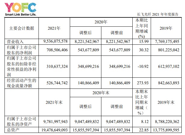 长飞光纤2021年全年取得营业收入95.36亿元,同比增长15.99%;归属于上市公司股东的净利润为7.09亿元,同比增长30.32%;不过,扣非后净利润为3.11亿元,同比出现10.92%的下滑。