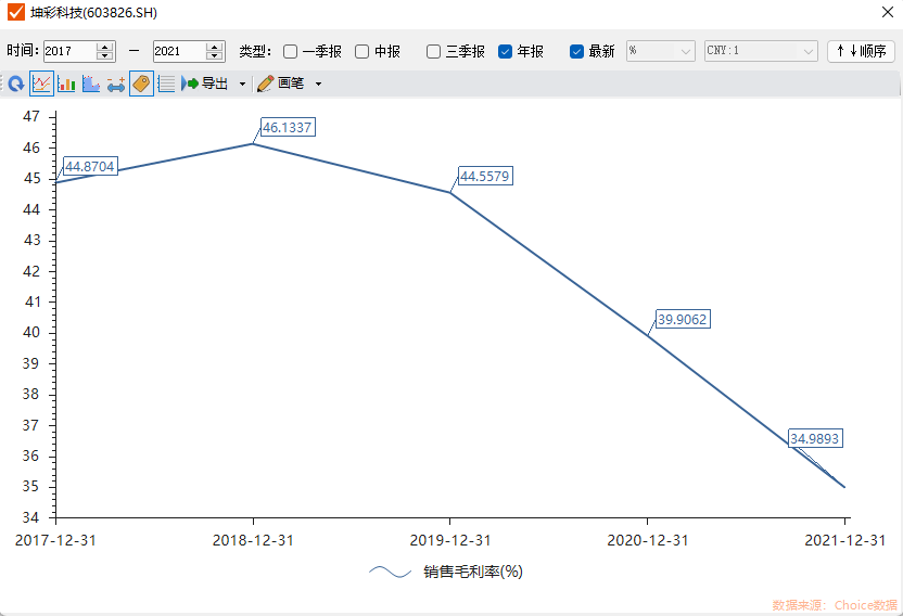 在上述背景下,2021年坤彩科技珠光材料的毛利率为35.24%,相较于去年同期减少4.94个百分点。事实上自2017年上市以后,公司整体毛利率屡创新低。