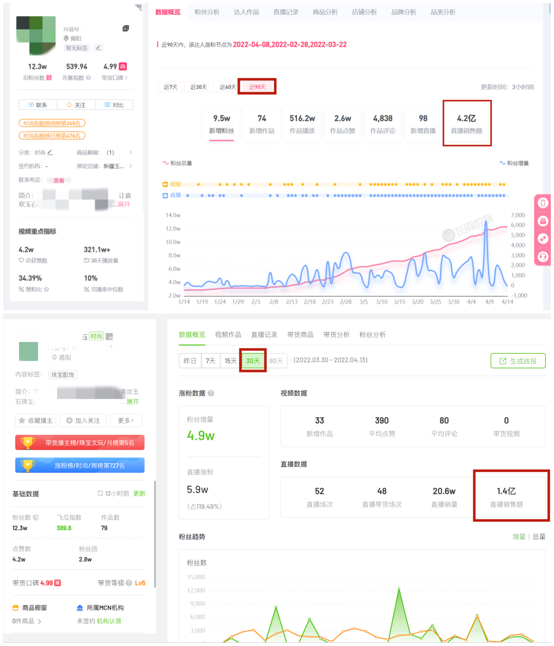 抖音某珠宝玉石主播,目前拥有粉丝12万+,但近30天直播带货销售额1.4亿元,近90天直播带货销售额4.2亿元。
