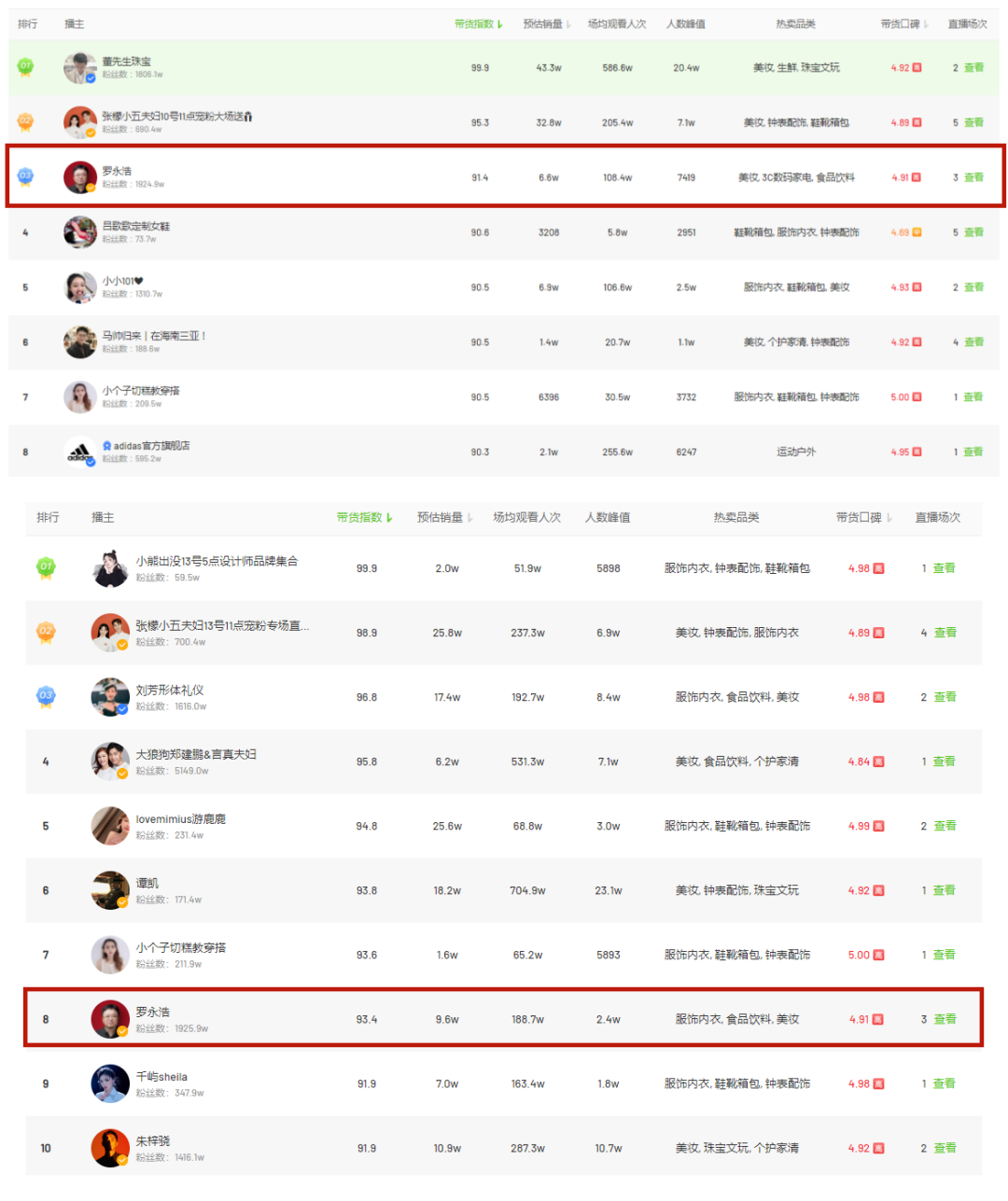 3月抖音数据显示,31天直播中18名主播或直播间曾登上过日榜冠军。其中19天的榜首,由7名头部主播占据,这些主播最少2次,最多5次进入过日冠军。另外12天榜首,则分别由12名主播占据。即使如“一哥”罗永浩,在3月的日榜排名中,也长期处于3-9名的位置,甚至连一次日榜冠军的位置都没有拿到过。