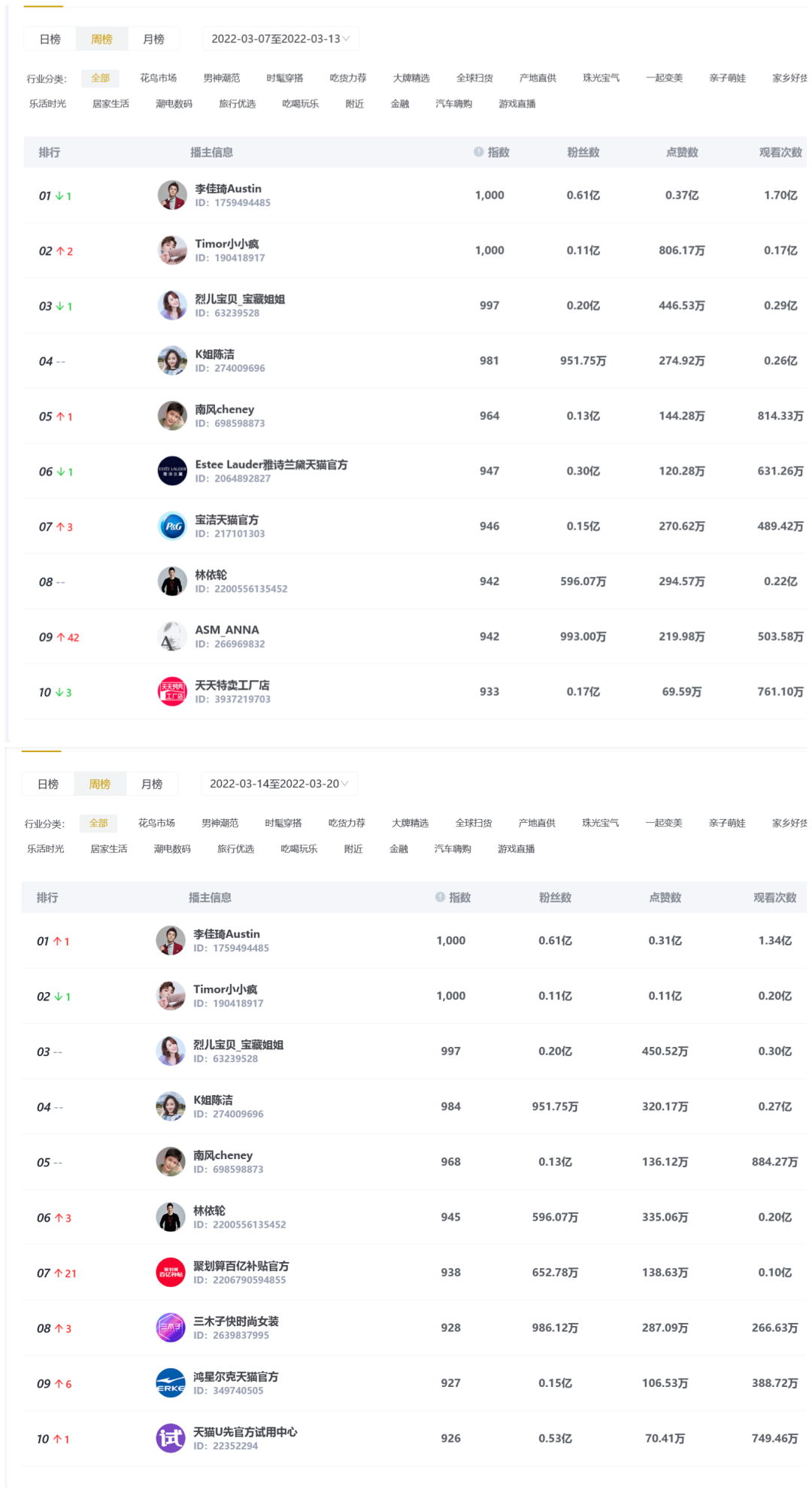 3月数据显示,在李佳琦开播日,淘宝直播带货日榜冠军没有悬念。当月李佳琦开播25天,霸榜日冠25次。6天未开播日,榜首位置则分属“烈儿宝贝”“K姐陈洁”等头部主播。同时,李佳琦Austin、Timor小小疯、烈儿宝贝、K姐陈洁、南风cheney等5大主播几乎包揽了3月份周榜前5名的位置,甚至次序都未发生过改变。