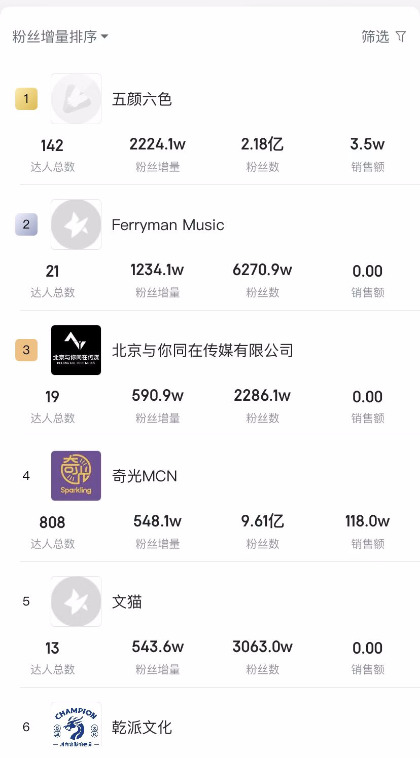 长沙某MCN机构负责人向辉(化名)旗下有9名主播,主要销售本地土特产、零食及电子产品等。超过10万粉丝的主播有5人,50万粉丝主播1人。这样的规模在抖音MCN机构里基本处于底层。“ 我们不奢望能冲进TOP50,但曾经有几次冲进了TOP100。”向辉表示,现在这9名主播能达到日均万元左右的销售额已经是很了不起的成绩了。