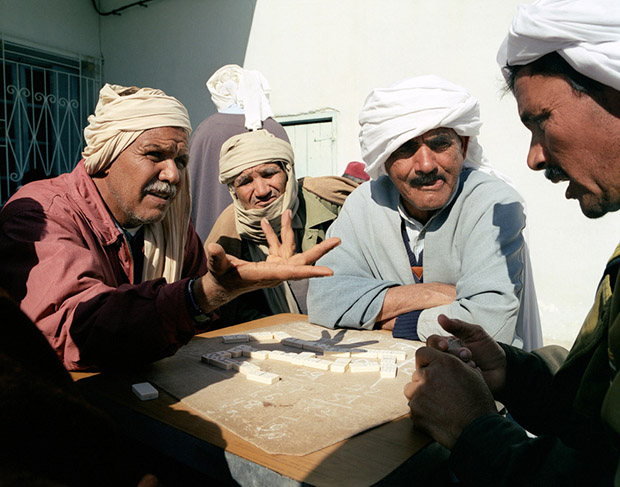 这句话摘自保罗·鲍尔斯《遮蔽的天空》,正是这句话让我辞去了在纽约一家杂志社的工作,来到突尼斯和摩洛哥享受生活的细节。晚上乘坐火车从首都突尼斯前往杜兹小镇,一路上好像步入了浩瀚的银河系。怪不得乔治·卢卡斯将《星球大战1》中很多场景放到这里拍摄。我花了2个月拍摄照片,我想把它们都拍进去——从首都突尼斯到辽阔的沙漠,再到朝圣者。上面这张照片是在杜兹小镇的Cafe Republique里拍摄的。他们正在一边玩多米诺骨牌一边喝着清晨的咖啡,他们交谈着、欢笑着,互相开着玩笑,而这就是他们的日复一日的悠闲生活。