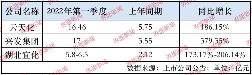 兴发集团近日公告称,一季度公司实现净利润17亿元,同比增长379.35%。湖北宜化预计其实现净利润5.8亿元-6.5亿元,同比增长173.17%-206.14%。