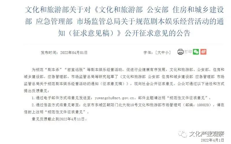 4月1日,为规范“剧本杀”“密室逃脱”等剧本娱乐经营活动,文化和旅游部等五部门起草了《关于规范剧本娱乐经营活动的通知》(征求稿意见),拟规定剧本杀娱乐经营单位使用的剧本脚本应当设置适龄提示,标明适龄范围;不得在居民楼、建筑物地下一层以下等地从事剧本娱乐经营活动等。
