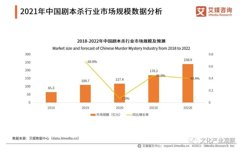 据36氪研究院发布的《2021年中国剧本杀行业研究报告》显示,仅2019年一年,全国剧本杀线下实体店已由2400家增至1.2万家。艾媒咨询数据显示,2020年中国剧本杀市场规模约为117.4亿元,2022年这一数字有望增长至238.9亿元。