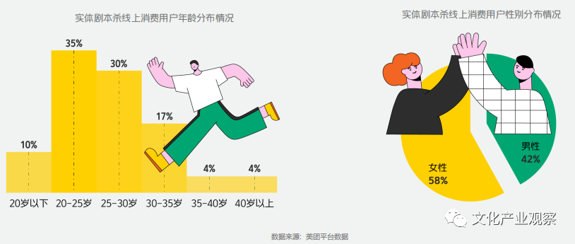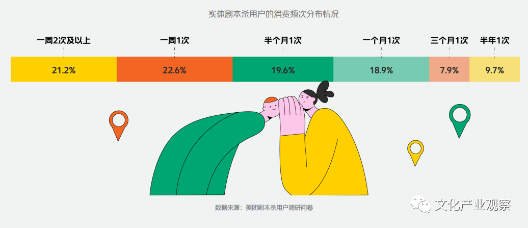 根据美团研究院发布的《2021实体剧本杀消费洞察报告》,2021年国内剧本杀消费者超七成为30岁以下的年轻人群,超四成用户消费频次在一周一次以上。