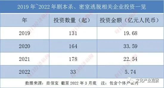 2019年,剧本杀、密室逃脱相关企业共发生131起投资,投资金额近20亿元;2020年、2021年,投资数量分别增长至164起、178起,投资总额分别为33.59亿元、22.54亿元。而今年前3个月,投资数量仅为33起,投资总额为5.74亿元。从投资变化来看,虽然整体上仍呈现增长趋势,但在2021年以来,增速明显放缓。