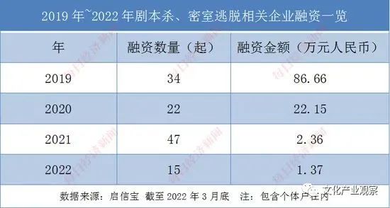 在融资领域,变化更加明显。2019年,剧本杀、密室逃脱相关企业共完成34起融资,融资总额共86.66亿元;而到了2021年,融资数量虽然增长至47起,但融资总额骤降,仅2.36亿元。