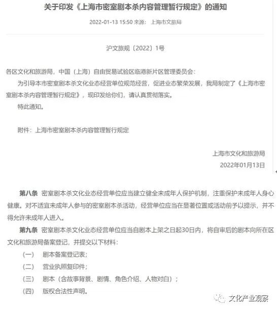 2022年开年,上海便发布了《上海市密室剧本杀内容管理暂行规定》,随后,辽宁省、天津市、重庆市也发布了相关管理规定。