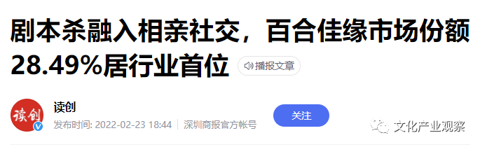 今年2月22日,第三方数据调研机构易观分析发布了《中国在线婚恋交友行业分析2021》,报告提到了占市场份额28.49%的百合佳缘集团(旗下包含百合网、世纪佳缘),正在“创新直播、短视频等婚恋模式,辅以狼人杀、剧本杀等游戏融入相亲社交,打造新式婚恋社交。”