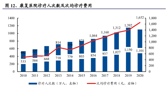 2020年,我国医院康复科出院人数达400万人,5年复合增速10.39%,康复医院出院人次达91万人,5年复合增速10.55%,综合医院康复科和专科康复医院齐头并进。客单价方面,康复医院总收入增速高于门诊增速及住院人数增速,客单价呈提升趋势。